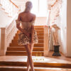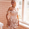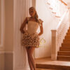 A luxurious mini dress crafted from smooth fabric with a delicate sheen. The design features a corset bodice with neat vertical seams that beautifully accentuate the bust and waist. The lower part of the dress is adorned with generous draping, creating expressive volume and adding dramatic flair to the look. Perfect for special occasions, parties, or formal events. Pair it with refined accessories and high-heeled shoes to complete an elegant ensemble.