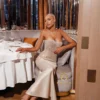 The corset hugs the waist snugly, sculpting an hourglass silhouette and gently flaring towards the hips, creating an elegant, contoured figure.