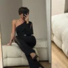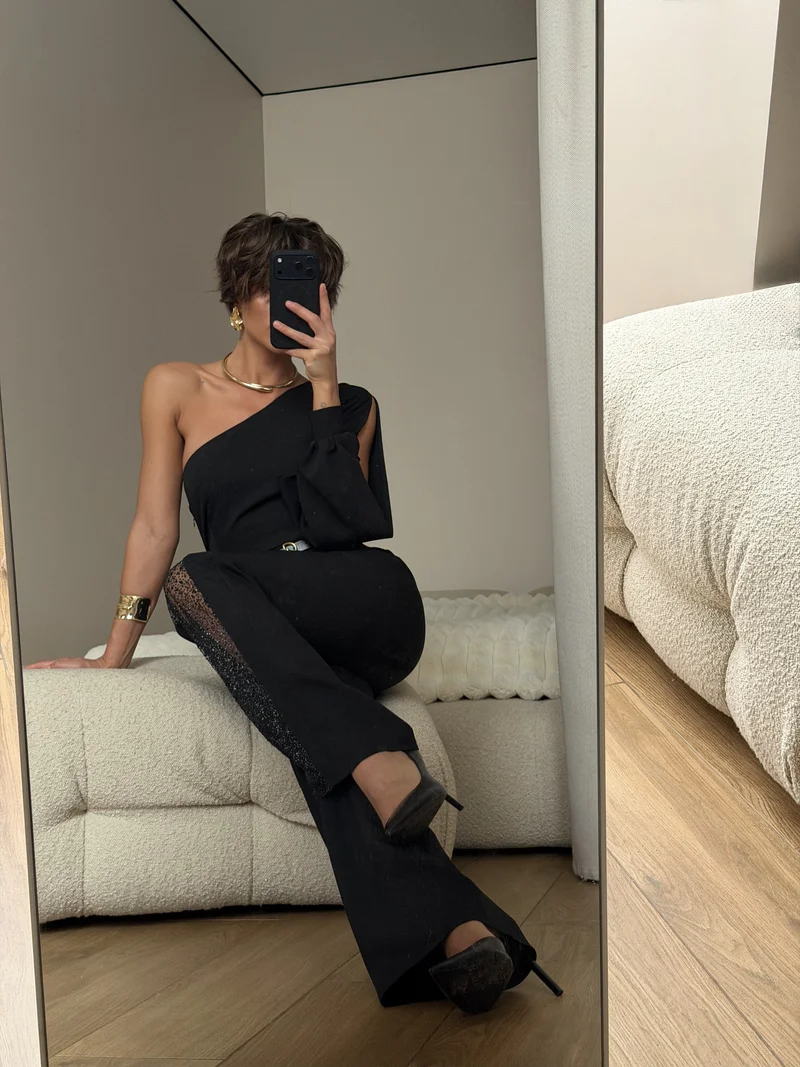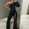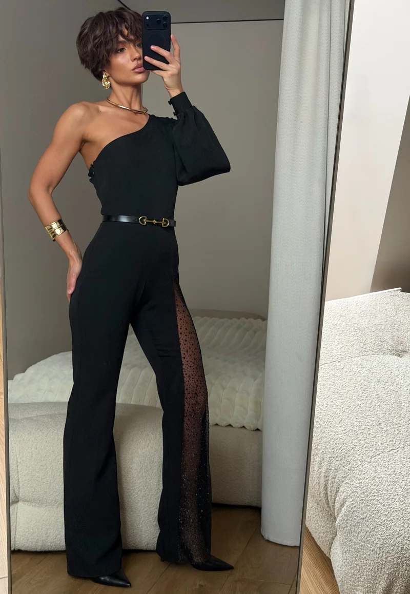 The jumpsuit has an asymmetrical design: one shoulder is open while the other is covered with a long sleeve, adding a modern and stylish touch. The main accent is on the long slit on the pant leg, adorned with a sheer glitter insert that adds sparkle and draws attention. The look is completed with black high heels, creating a refined and fashionable style, perfect for an evening out.