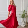 Crafted from premium suiting fabric, this piece combines structure with fluidity. The voluminous skirt, made with generous layers of fabric, flows beautifully with every step, creating an airy, graceful movement. The open back with delicate button fastening is a striking yet refined detail, complemented by puffed elbow-length sleeves for a touch of romance.