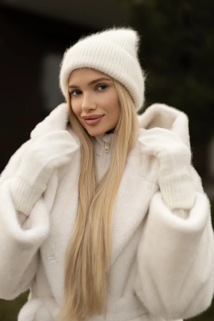 Height: 23 cm Soft and fluffy rabbit-angora wool has proven itself as a warm and cozy material. In a hat made from such yarn, you’ll feel comfortable even in strong frost. Delicate wool fibers surround the hat with a beautiful airy halo, making this headgear especially suitable for a delicate feminine look.