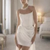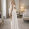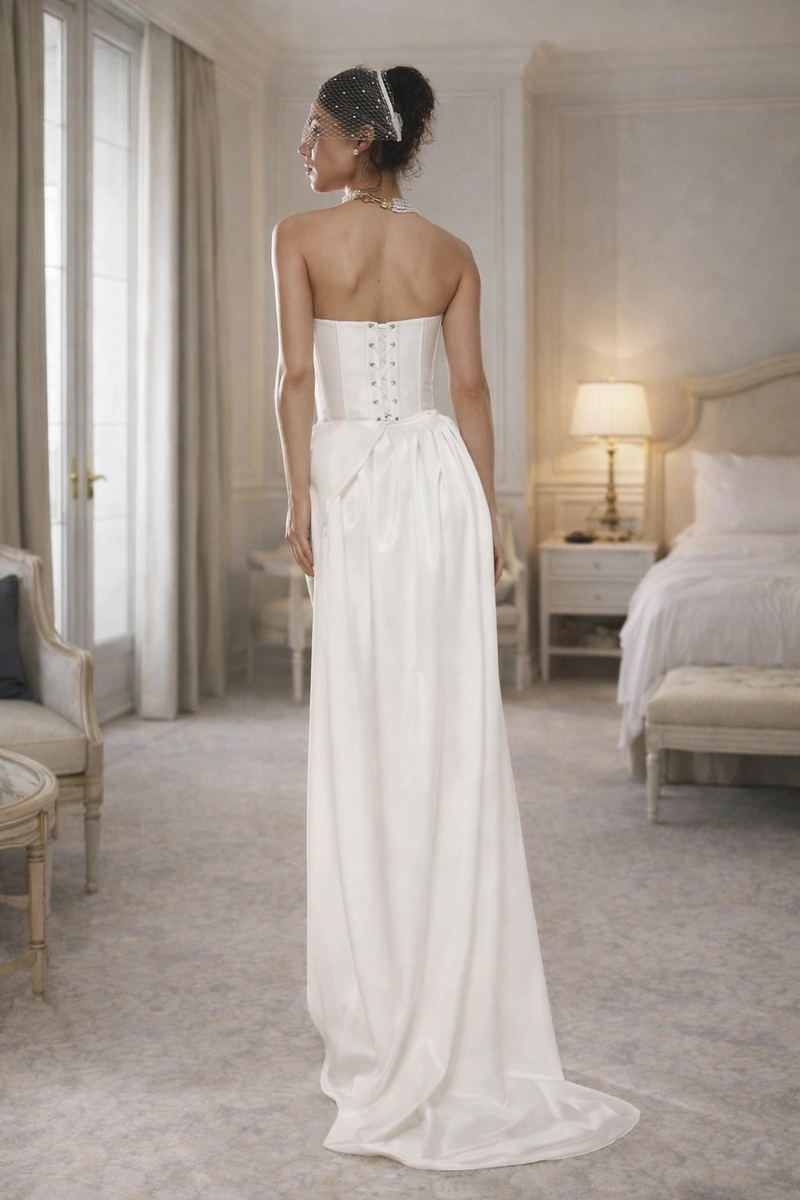 A removable long train makes a particularly stunning statement, gracefully cascading from the hip and infusing the ensemble with drama and a Haute Couture vibe.