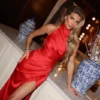 A luxurious flowing satin maxi dress — the embodiment of elegance and sensuality. Its thoughtfully designed cut beautifully enhances the silhouette: the fabric drapes gracefully over the body, accentuating the waist, while the high slit adds a bold and dynamic touch.