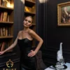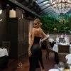 The sleek, strapless silhouette gently contours the body, creating a refined and feminine shape.