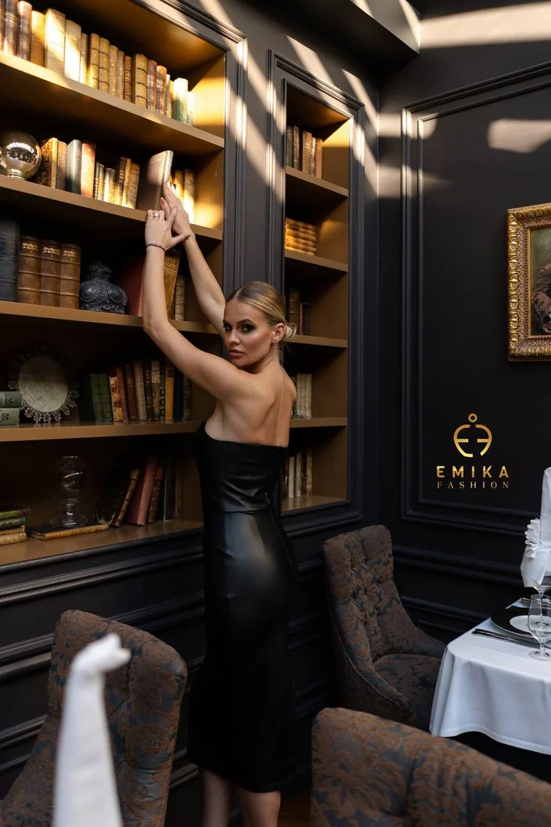 A striking black eco-leather dress designed to highlight elegance and confidence.
