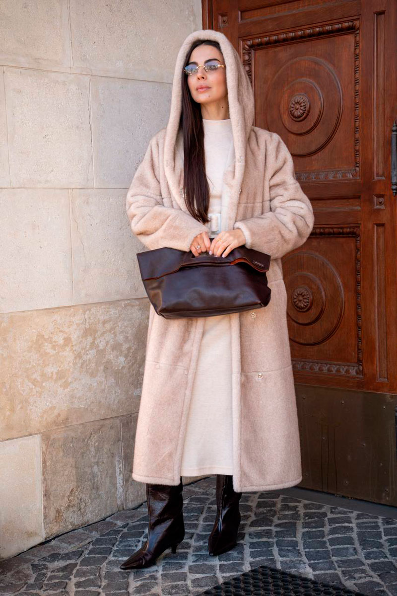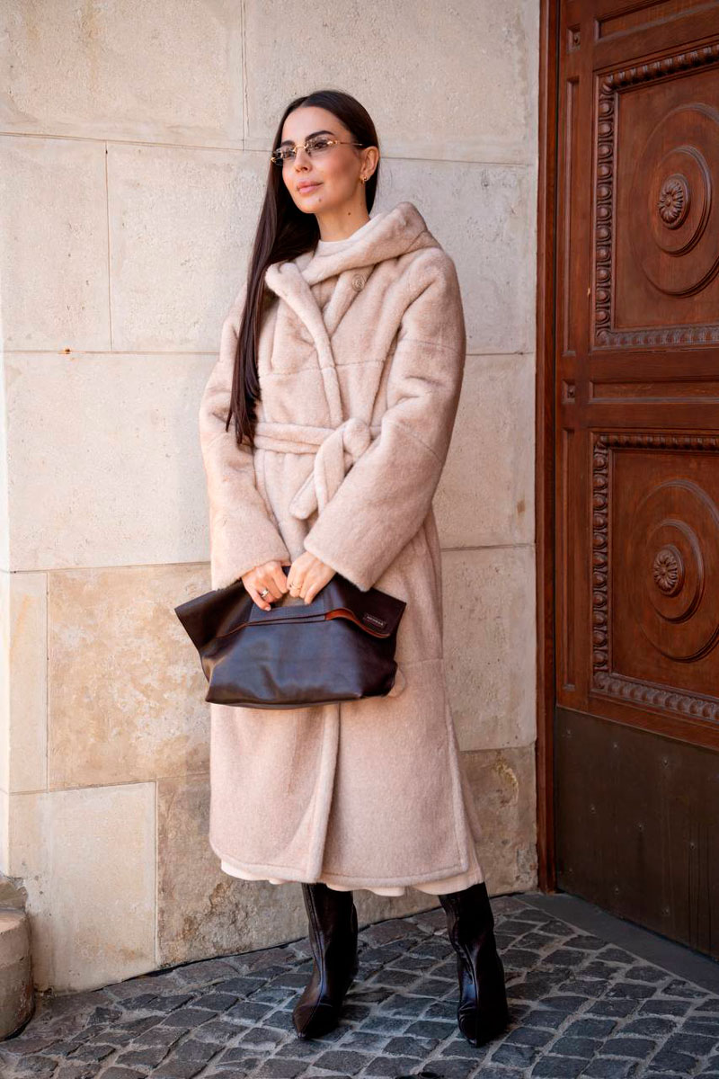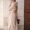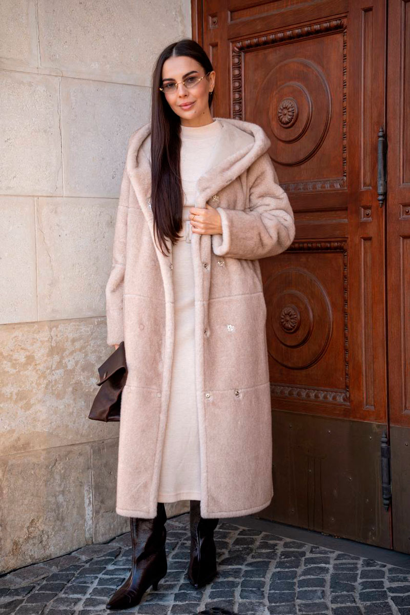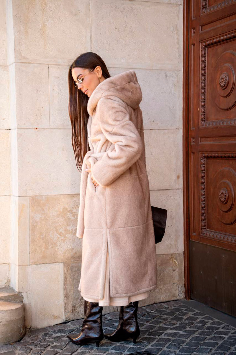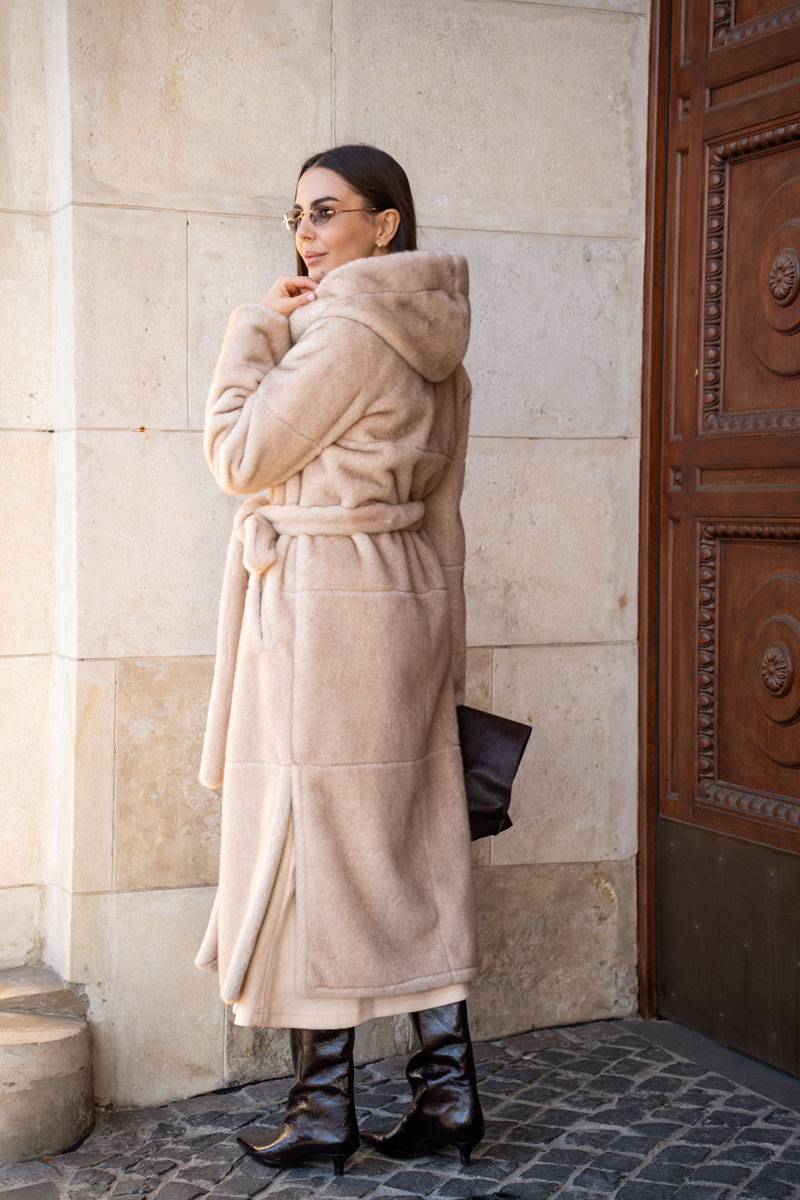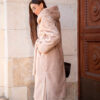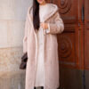 A luxurious longline coat crafted from premium faux mink fur, offering both warmth and sophistication. The design features a soft hood, elegant collar shape, and secure hook fastening for a refined silhouette. The inside is finished with a smooth jacquard lining, adding a touch of understated elegance.