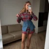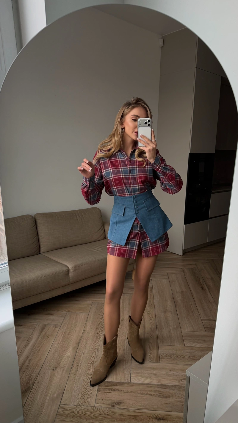 Mini length in a sturdy denim fabric. Decorative buttons and shaped overlay details emphasize the waist, creating a feminine and striking silhouette.