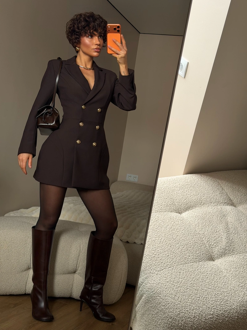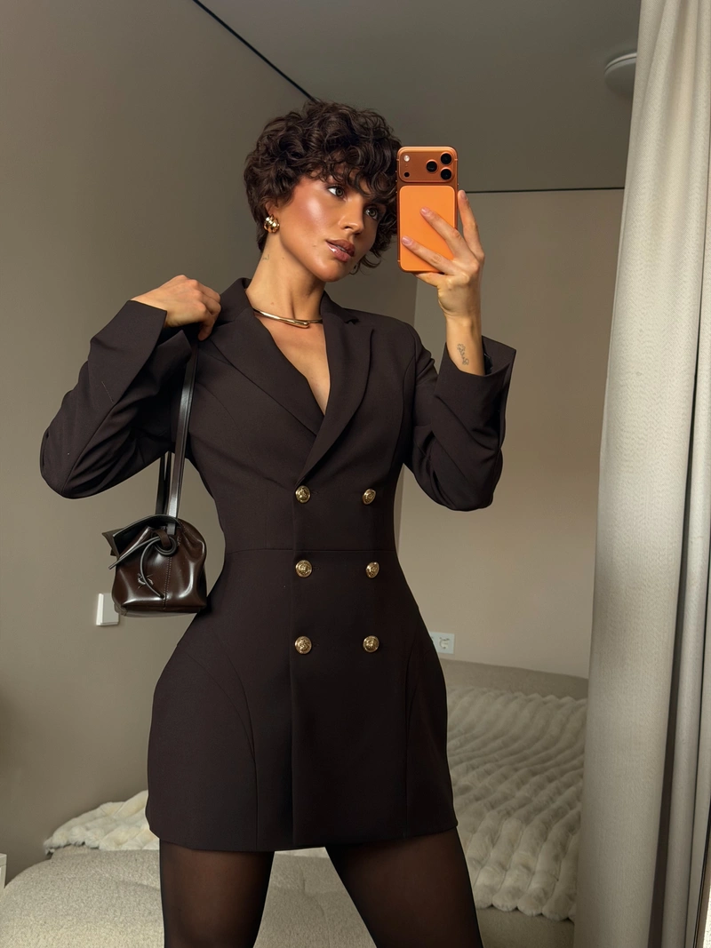The double-breasted closure accentuates the waist, while the deep chocolate shade adds warmth and a touch of luxury. The dense fabric holds its shape beautifully, ensuring a flawless appearance in any setting.