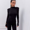 An elegant black turtleneck made from bandage fabric with accentuated shoulders — the perfect blend of style and daring femininity. The softly figure-hugging material highlights the silhouette, creating a refined shape, while the structured shoulders add a modern, bold touch. This turtleneck effortlessly serves as a base for both office and evening looks, bringing confidence and style to every detail.