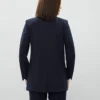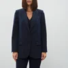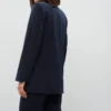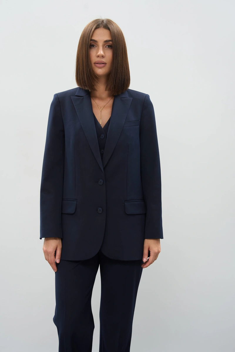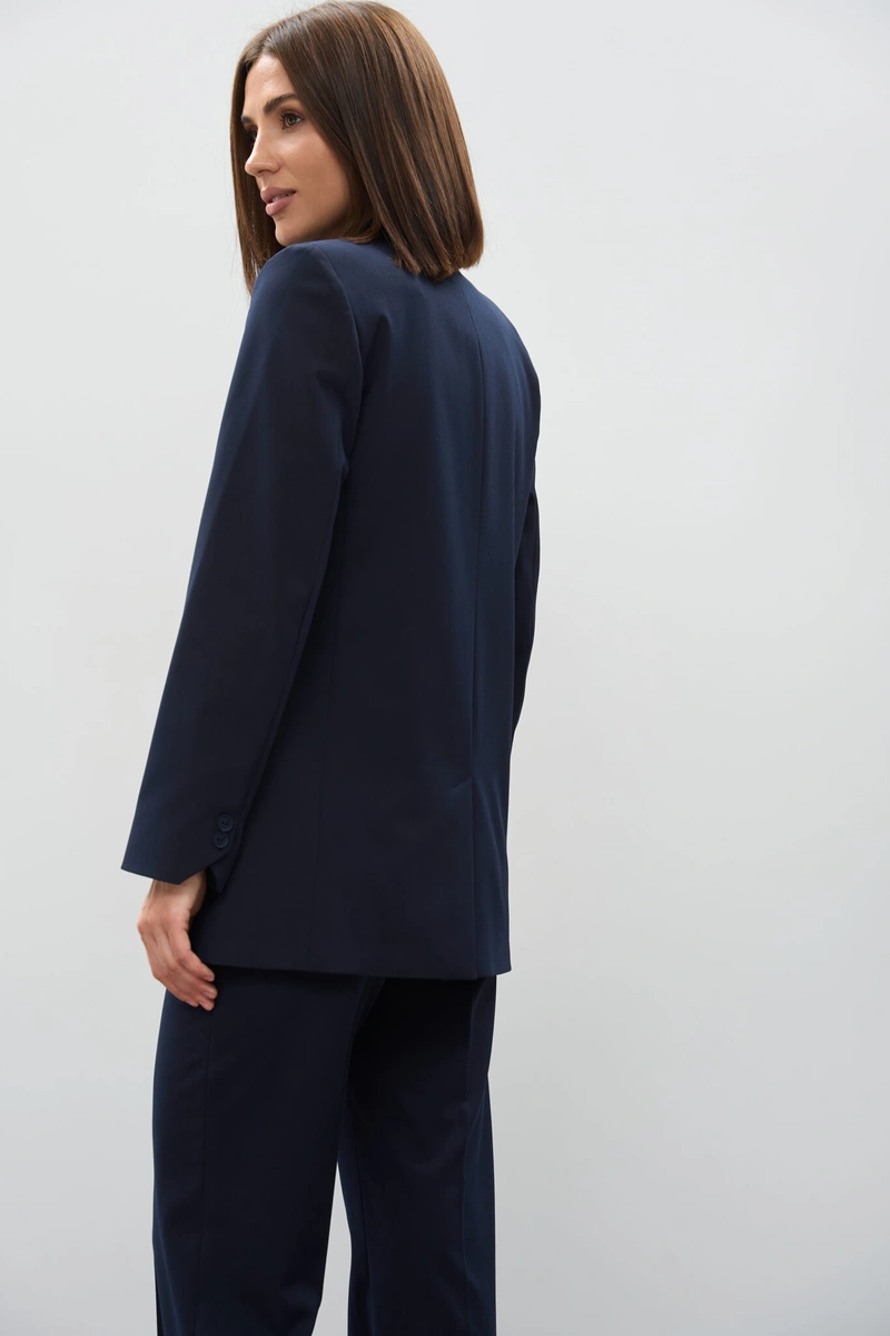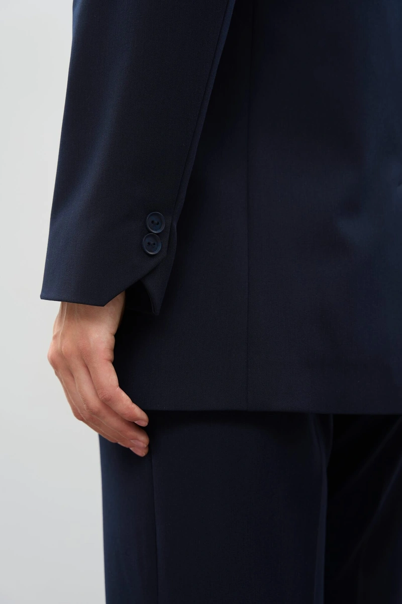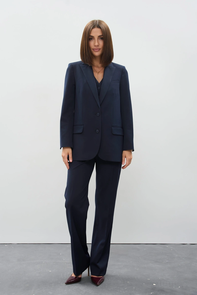 The straight-leg trousers complete the ensemble with a clean, elongated line, making this suit a versatile choice for both professional settings and chic everyday outfits.