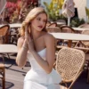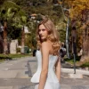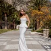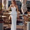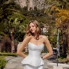 Experience the grandeur of every moment in a corset that transforms your silhouette into a work of art. Crafted from dense satin with a subtle, noble sheen, Aura combines classic structure with modern architectural accents. Its signature pointed neckline highlights the décolleté, while the elongated peplum creates perfect proportions, accentuating a delicate waist and harmonious bridal silhouette.