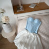 The bubble skirt is made of satin, giving it a smooth texture and a subtle shine. It has a voluminous, airy shape due to a special cut, where the fabric’s hem creates a rounded effect. This model features a combination of two colors: black and white. The skirt sits at the waist thanks to an elastic band or a fitted waistband, creating a feminine and expressive silhouette.