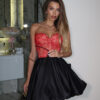 The bubble skirt is made of satin, giving it a smooth texture and a subtle shine. It has a voluminous, airy shape due to a special cut, where the fabric’s hem creates a rounded effect. This model features a combination of two colors: black and white. The skirt sits at the waist thanks to an elastic band or a fitted waistband, creating a feminine and expressive silhouette.