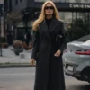 With a length of 130 cm, this coat is a true style statement. The maxi silhouette visually elongates the figure, creating a flowing, almost regal stride. Sharp shoulders and a deep English collar add architectural structure, while the cinched waist subtly highlights the delicate femininity of the look.