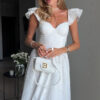Delicate ruffled off-shoulder straps add a touch of lightness and refinement to the look.