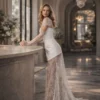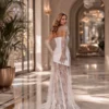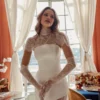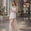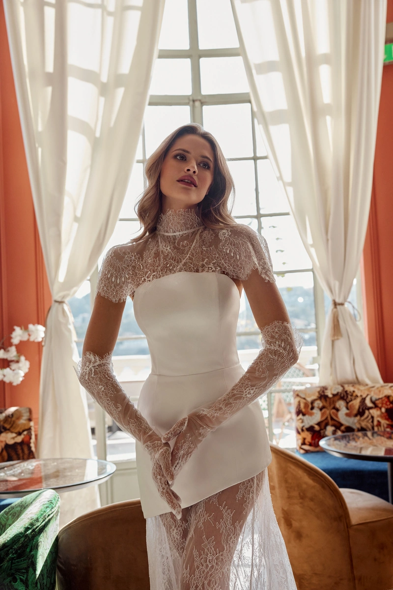 This set is perfect for a bride who values style, individuality, and freedom of choice. With the cape — a ceremonial, aristocratic look for the wedding; without it — a bold, light, and contemporary outfit for the evening celebration.