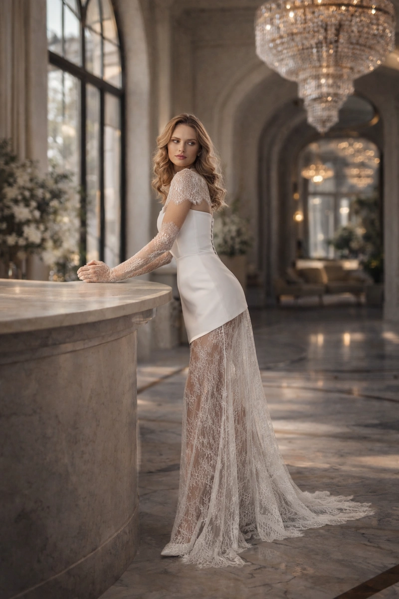 The top is crafted from structured, luxurious satin (mikado) with a flawless fit that enhances the silhouette and emphasizes clean, elegant lines. The skirt features a straight cut with a sheer lace overlay, adding lightness and movement while creating a graceful interplay of shapes.