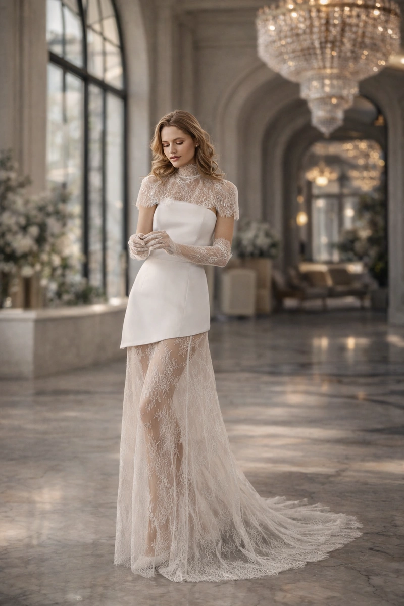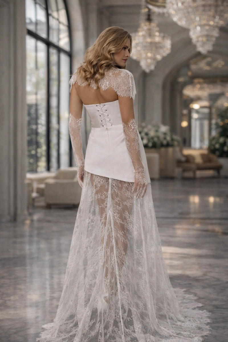 This ensemble combines architectural minimalism with refined vintage elegance. The corset top and sheath skirt paired with a delicate lace cape create a transformative effect — from bold modernity to regal sophistication.