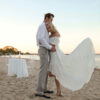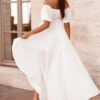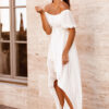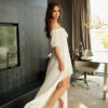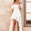 Weightless asymmetrical dress made of light chiffon fabric, created by the designers: a boat neckline with an elastic insert for a comfortable fit, short puff sleeves, a high waistline and a flared skirt with an elongated back.