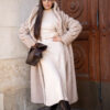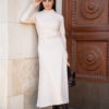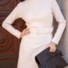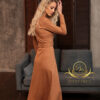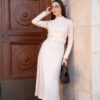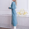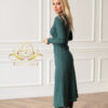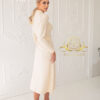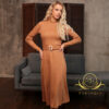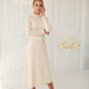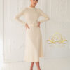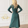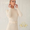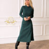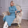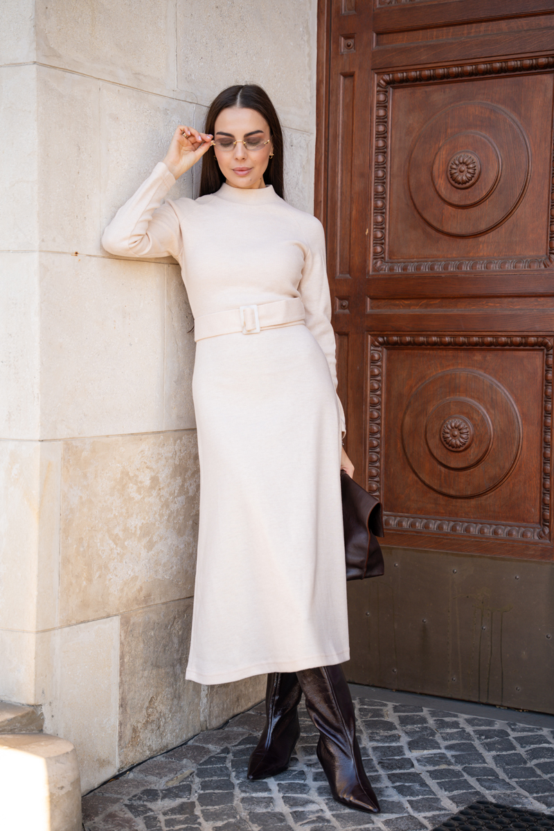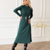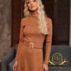 A flared warm dress made of comfortable knit fabric. The item has a stand-up collar and raglan sleeves. Comes with a belt with a buckle.