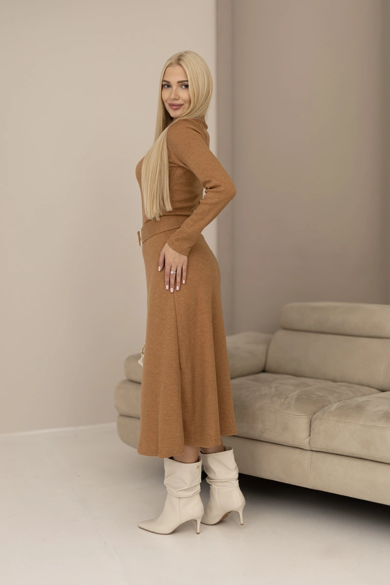 A flared warm dress made of comfortable knit fabric. The item has a stand-up collar and raglan sleeves. Comes with a belt with a buckle.