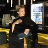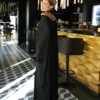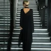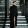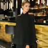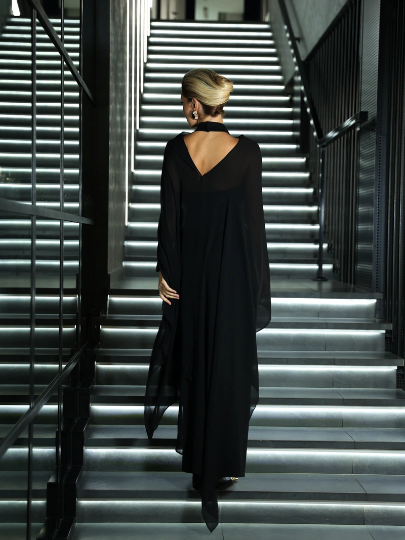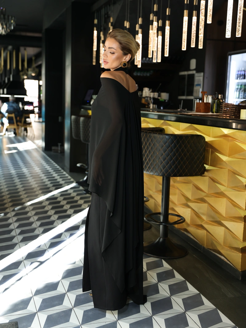 The base is crafted from dense bandage knit that perfectly accentuates the figure, creating smooth lines and a flawless silhouette. On top lies a lightweight chiffon cape that drapes effortlessly, adding mystery and movement to the look.