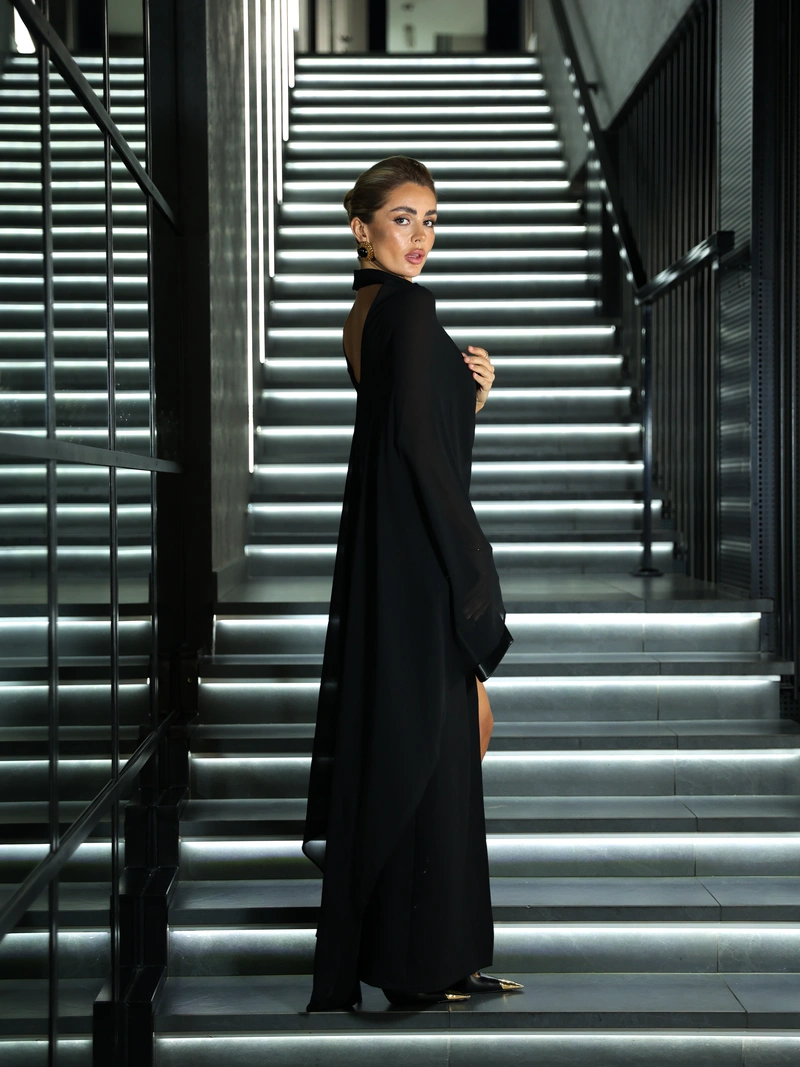 The sheer chiffon creates a sophisticated contrast with the structured base, allowing the dress to be worn either more modest and covered, or more open — depending on your mood.