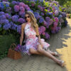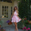 The delicate floral print in soft pink hues, reminiscent of hand-painted watercolors, evokes the romance of blooming gardens and sun-drenched afternoons.