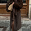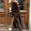 The coat has a length of 130 cm, making it suitable for both everyday wear and formal occasions. A belt at the waist highlights the feminine silhouette, while the relaxed fit ensures comfortable movement.