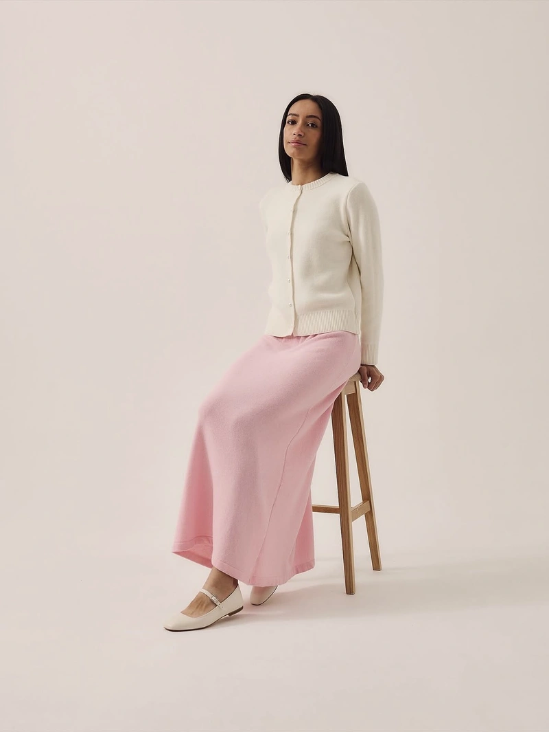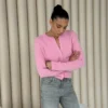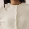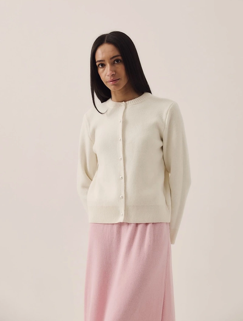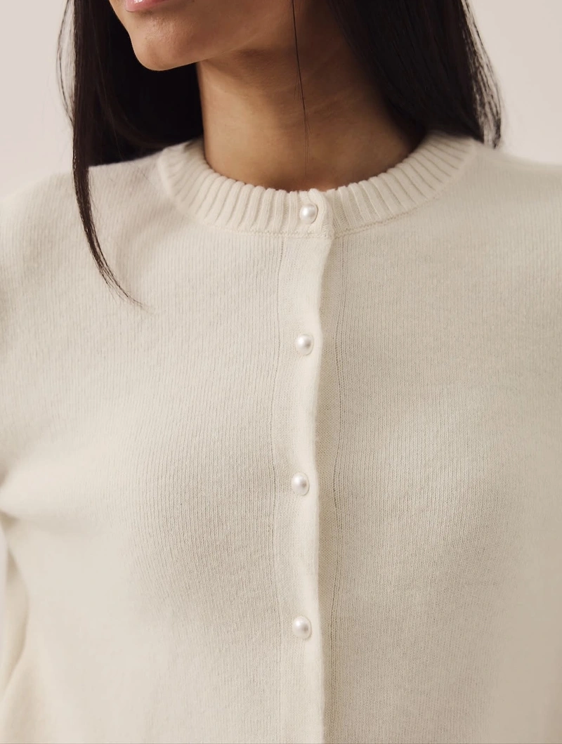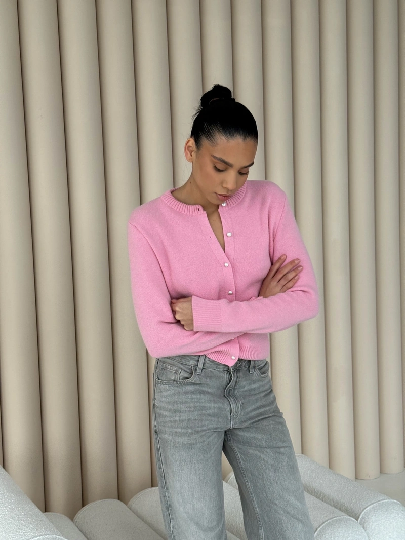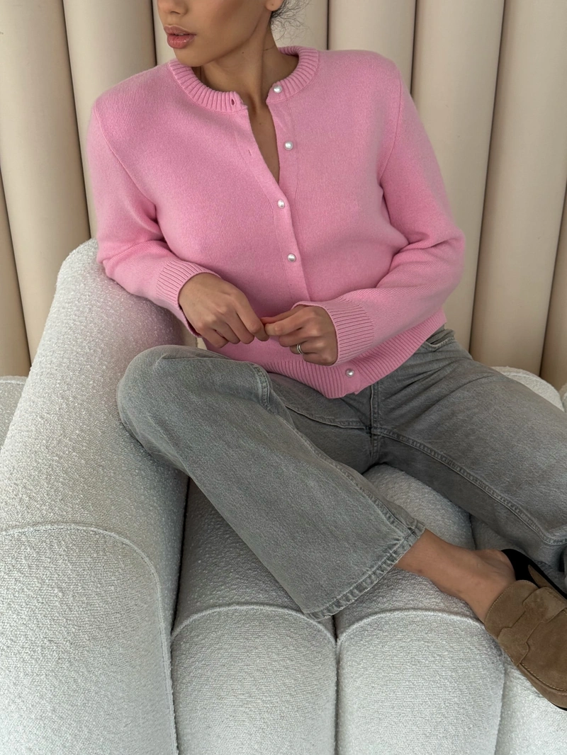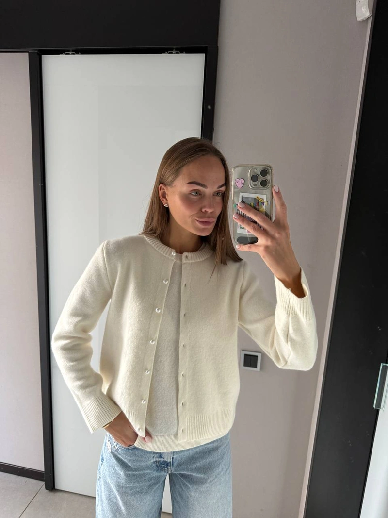 The classic silhouette with a round neckline highlights femininity, while elasticated cuffs and hem ensure a perfect fit. Delicate buttons add a subtle vintage touch, allowing the cardigan to be worn as a standalone top or layered with ease.
