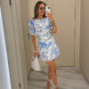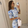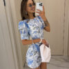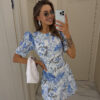 Voluminous short sleeves add an airy touch, while the delicate floral print in shades of blue and grey enhances the refined style. The highlight of this piece is the gracefully open back, bringing femininity and a hint of charm to your look.