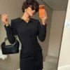 A sleek and sophisticated viscose mini dress with elegant button detailing down the front.