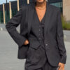 – The slightly fitted vest is an essential element that adds completeness and sophistication to the look. The vest pairs beautifully with the blazer, creating a harmonious ensemble that appears refined and appropriate in any situation.