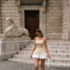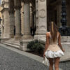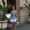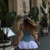 This look is a striking example of how basic pieces can feel truly luxurious. The denim peplum top, with its waist-accentuating cut, creates an hourglass silhouette, while the airy balloon skirt adds volume and movement.