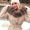 A puffer jacket with Finnish sable fur in a sable-like hue. These models have exceeded all our expectations. The fur is luxurious and beautiful, made from genuine Finnish sable. You can cinch the waist with a belt or wear it as oversize. The fabric is water-repellent and waterproof. It’s 105 cm long and comes in sizes S and M. Available in colors beige and graphite. Ideal for winter, suitable for temperatures down to -25°C.