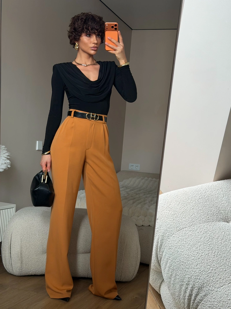 This bodysuit is crafted from a double layer of fabric, ensuring full coverage and a flawless structure that beautifully holds its shape. The long sleeves add a refined sense of elegance, while the soft, fluid drape creates a voluminous neckline that delicately highlights the décolletage, adding evening sophistication to the silhouette.