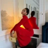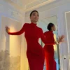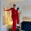 The figure-hugging mermaid/column cut gracefully accentuates the body’s natural lines, while the maxi length adds a touch of grandeur and high-status elegance. The closed silhouette with an elegant high neckline and long, slim sleeves creates the iconic “covered chic” aesthetic — restrained, yet irresistibly alluring.