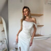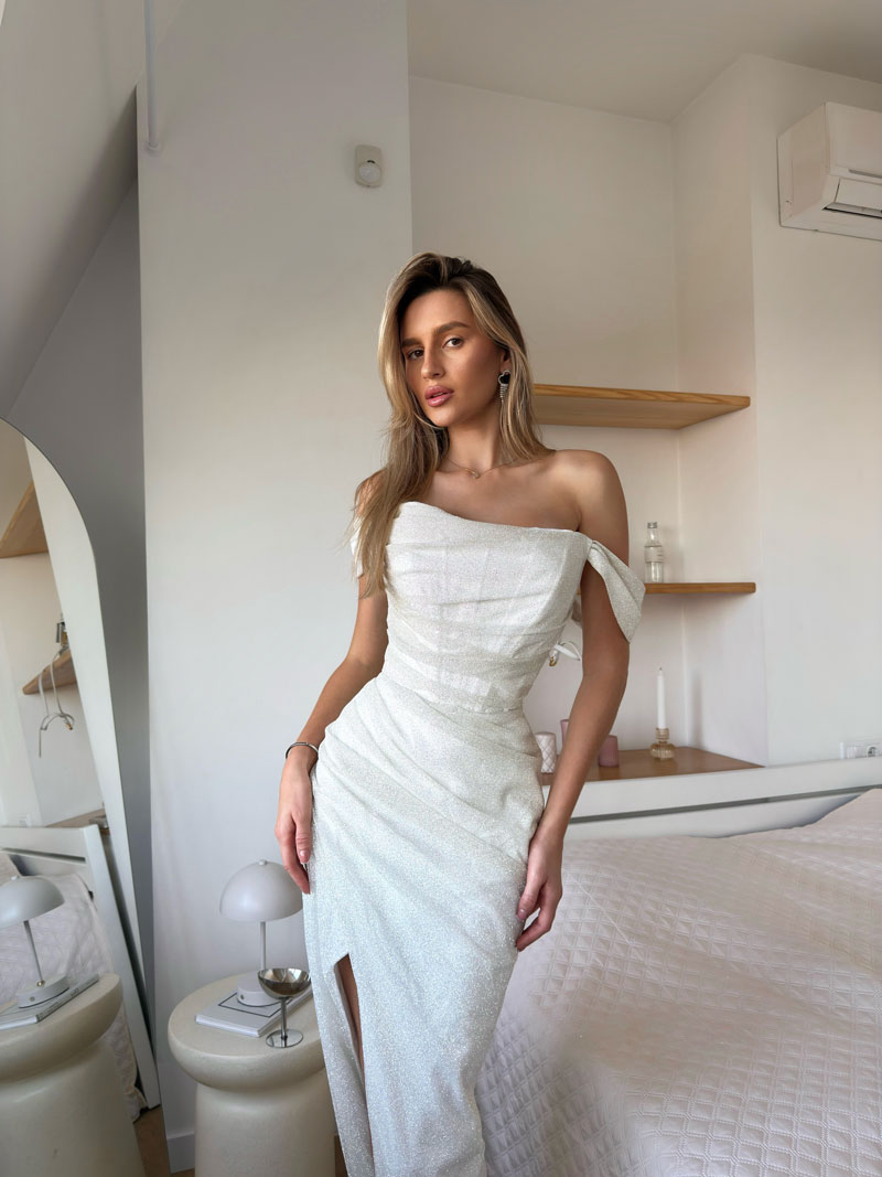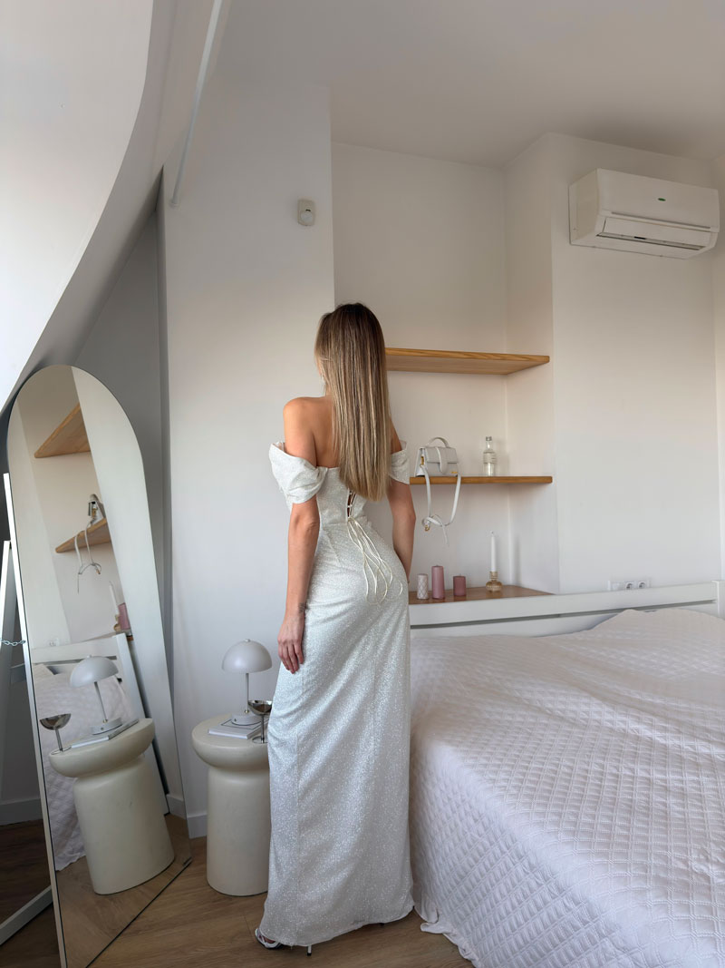 A stunning maxi dress with a corset base is the epitome of elegance and luxury. It is crafted from shimmering mesh with a unique coating, adding a distinctive shine and texture. The dress accentuates the figure, creating a striking silhouette, while the slit lends sophistication and drama to the look. The premium-quality materials ensure comfort and durability, making this dress the perfect choice for special occasions and parties.