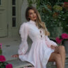 Voluminous pleated sleeves and a flared skirt create a graceful, feminine silhouette, while the high neckline adds a touch of timeless elegance.