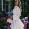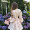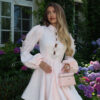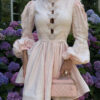 Details: butterfly embroidery, front closure, puff sleeves, flared skirt