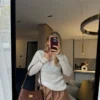 The “Bunny” sweater is crafted from premium Italian wool yarn. It consists of 40% wool, 30% cotton, and 30% acrylic, making it warm, soft on the skin, and comfortable to wear. It features a sheer look, a cozy fit, and extended sleeves.