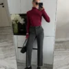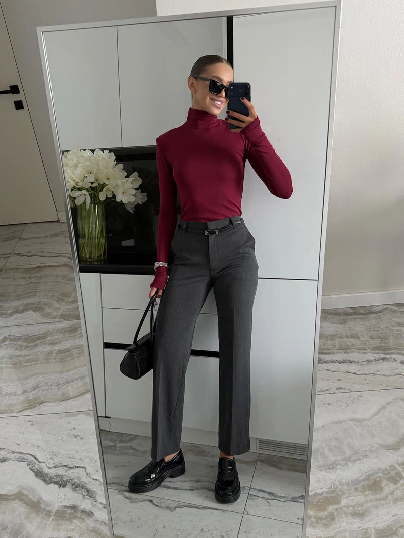An elegant black turtleneck made from bandage fabric with accentuated shoulders — the perfect blend of style and daring femininity. The softly figure-hugging material highlights the silhouette, creating a refined shape, while the structured shoulders add a modern, bold touch. This turtleneck effortlessly serves as a base for both office and evening looks, bringing confidence and style to every detail.