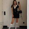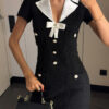 An elegant and refined dress made from dense black tweed. This classic-style piece features short sleeves and a fitted silhouette that accentuates the figure. A contrasting white collar and a decorative bow with a pearl button add a touch of vintage charm. The dress is adorned with a row of pearl-like buttons and patch pockets with matching decorative buttons.