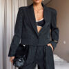 • Blazer: Designed with a minimalist cut, deep neckline, and no fastening, giving the look a bold and edgy character. The cropped length accentuates the waist, creating balanced proportions.