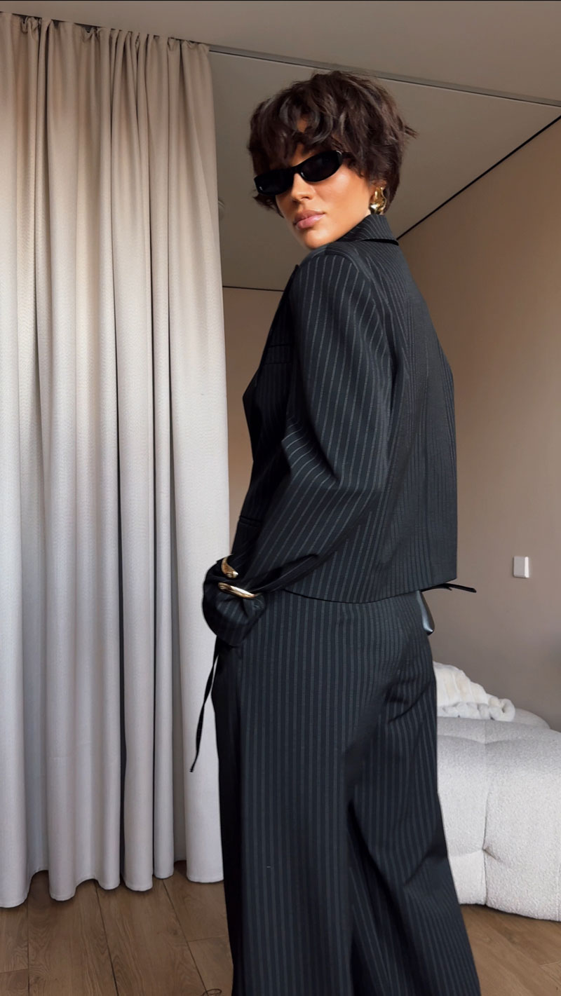 This stylish suit comes in a dark shade and consists of a cropped blazer and wide-leg trousers.