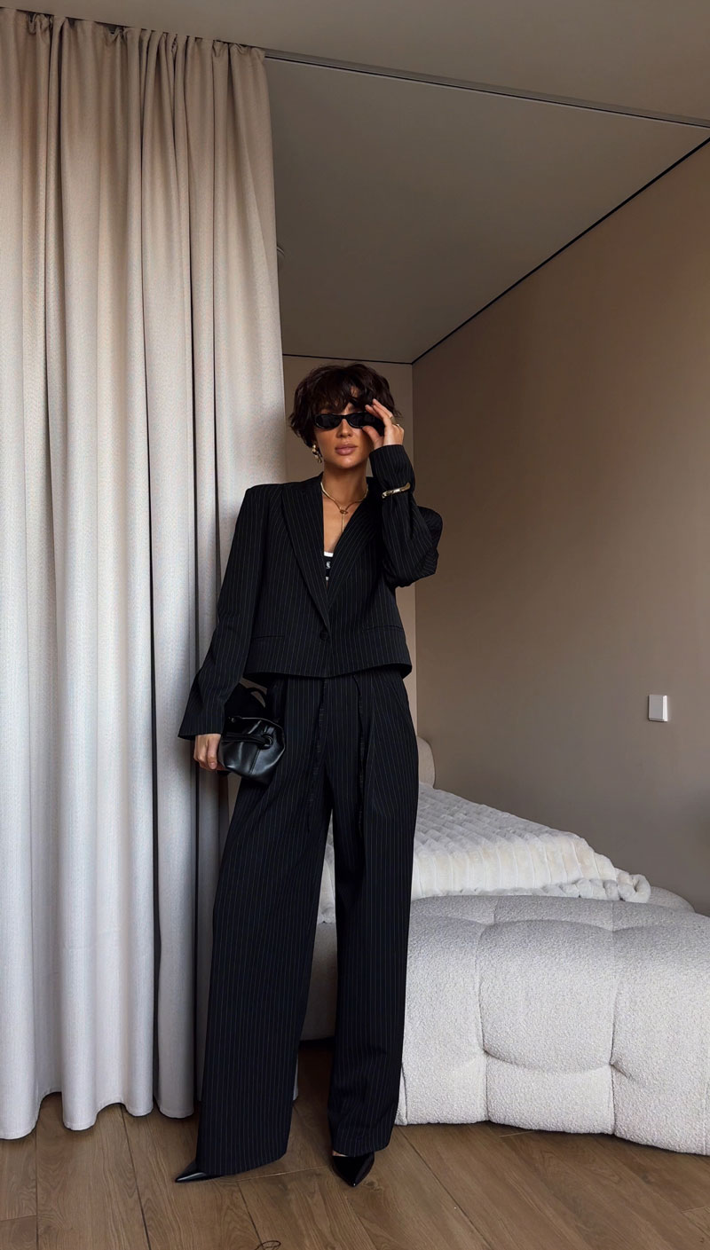 This outfit combines elegance with a relaxed urban style, making it perfect for contemporary fashion looks.