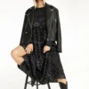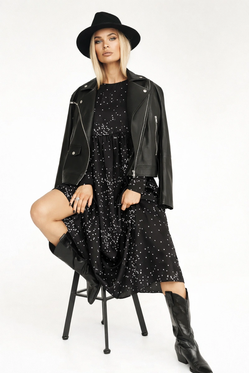 A midi dress does not require rich decor to attract attention. A contrasting polka dot print does this job perfectly. The model is made of sliding satin, which drapes in soft waves on a flared skirt. The product was complemented with long sleeves with cuffs and a round neckline. Welt pockets are made in the side seams.
