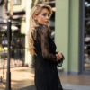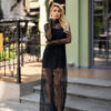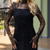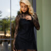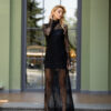 The black lace dress looks elegant and seductive. It has a fitted silhouette and consists of two parts: a mini dress underneath, which creates the base layer, and a long, transparent lace overlay on top. The upper part features a high neckline and long fitted sleeves, adding sophistication to the look. The delicate lace detailing makes the dress exquisite and romantic, while the semi-transparent effect adds a touch of mystery and boldness. A long hem with lace trim completes the luxurious look.