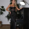 The Noir Enchanté dress is a celebration of refined luxury and impeccable elegance. Flowing black satin drapes over the silhouette like midnight, catching the light with every movement to create a mesmerizing, luminous effect. The corset bodice, adorned with delicate draping and sheer panels accented with subtle embellishments, gracefully defines the waist, turning the figure into a vision of femininity and sophisticated style.