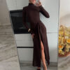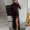 An elegant long dress in chocolate-brown color. It features a fitted silhouette, long sleeves, and a high neckline. The front is adorned with draping and a wrap detail, creating a graceful slit on one leg. The fabric appears soft and stretchy, accentuating the figure. This outfit is perfect for evening events or special occasions. The biflex material is soft, stretchy, and figure-accentuating.